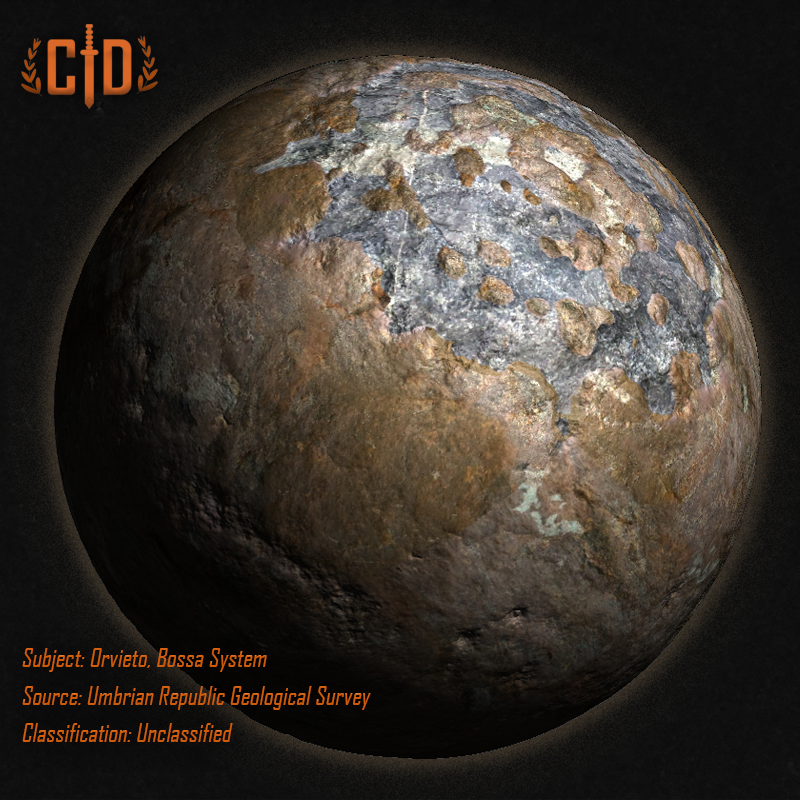 A cold dreary rock of a world, Orvieto nevertheless proved to be an important target for colonization during the early years of the Republic's first expansion into the wider galaxy. Scans of the terrestrial giant revealed mineral deposits in sufficient quantities to fuel further expansion. It also possessed a very active vulcanism, with tons of molten material deposited on its surface every year.